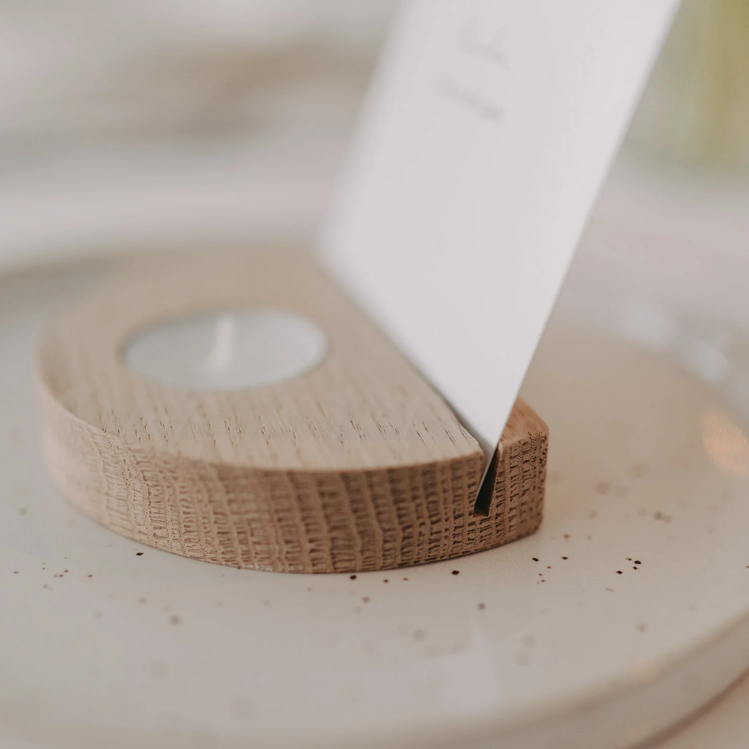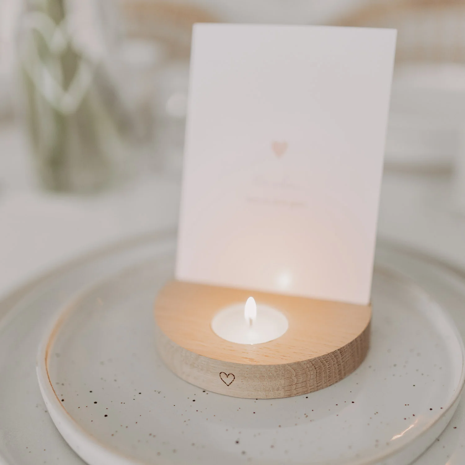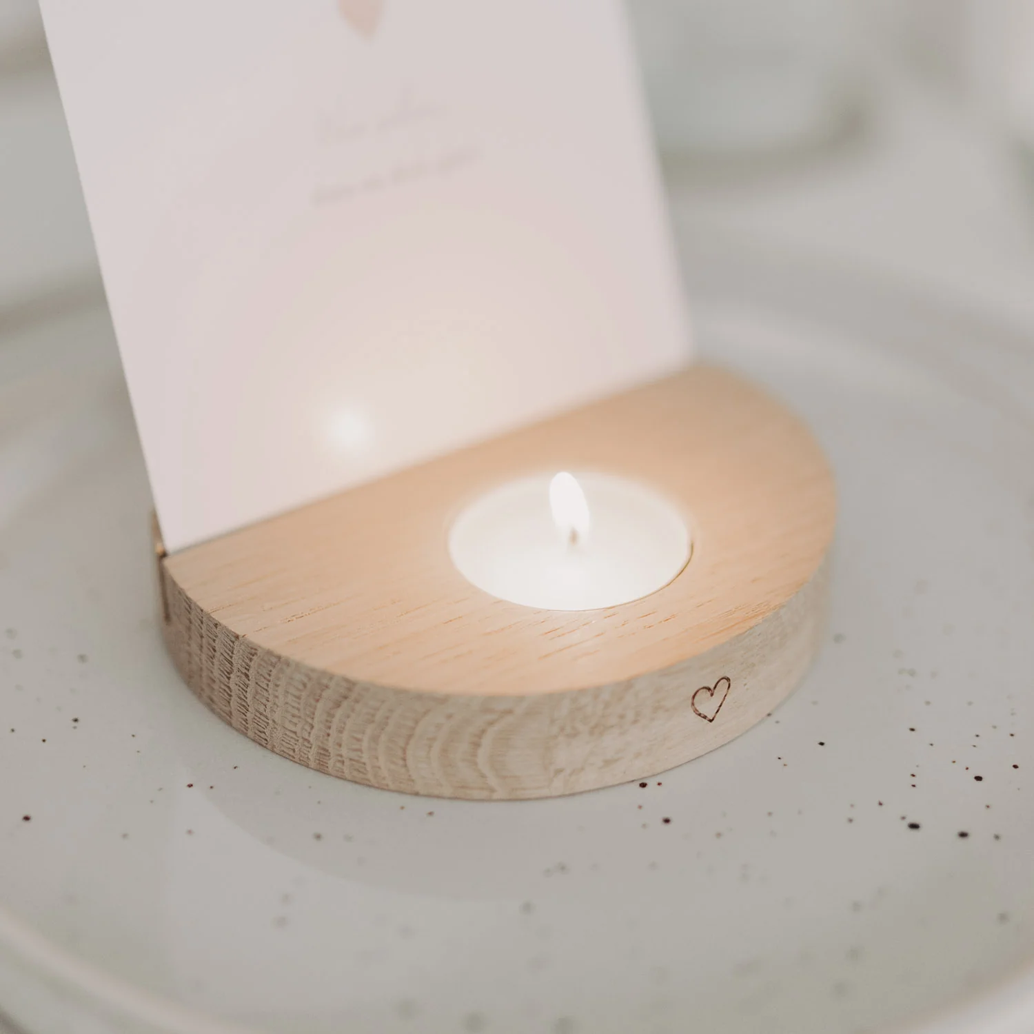 Der Halter bietet Platz für ein Teelicht in der integrierten Aussparung und gleichzeitig eine praktische Schlitzhalterung für Karten, Fotos oder kleine Botschaften. So wird jeder Moment – ob Jubiläum, Hochzeit, Einzug oder einfach ein „Ich denke an dich“ – zu etwas ganz Besonderem.