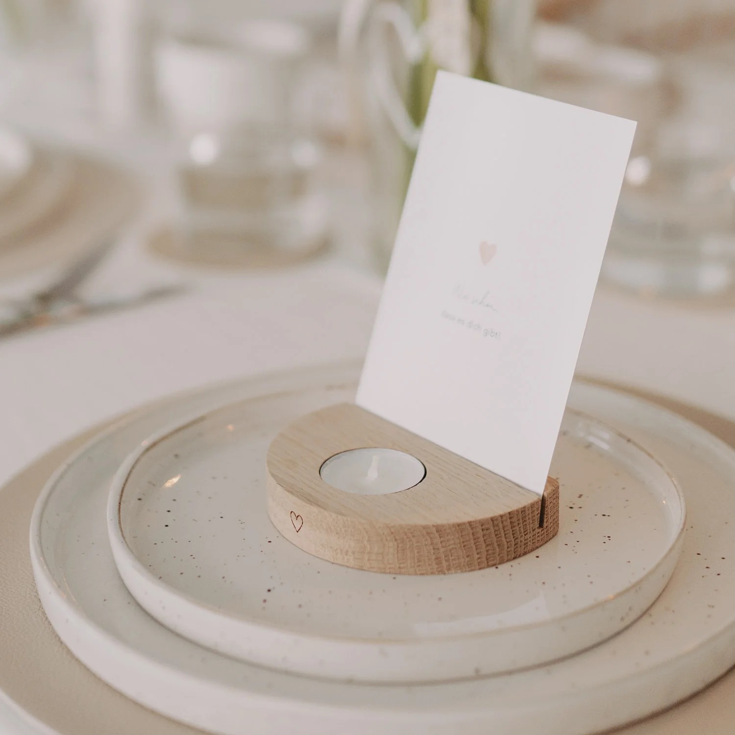 Gefertigt aus hochwertigem Holz und verziert mit einem fein eingravierten Herzmotiv, strahlt der Kartenhalter natürliche Wärme und zeitloses Design aus. Ob auf dem gedeckten Tisch, im Wohnzimmer, auf der Fensterbank oder als liebevolles Geschenk: Er setzt jedes Motiv stilvoll in Szene.