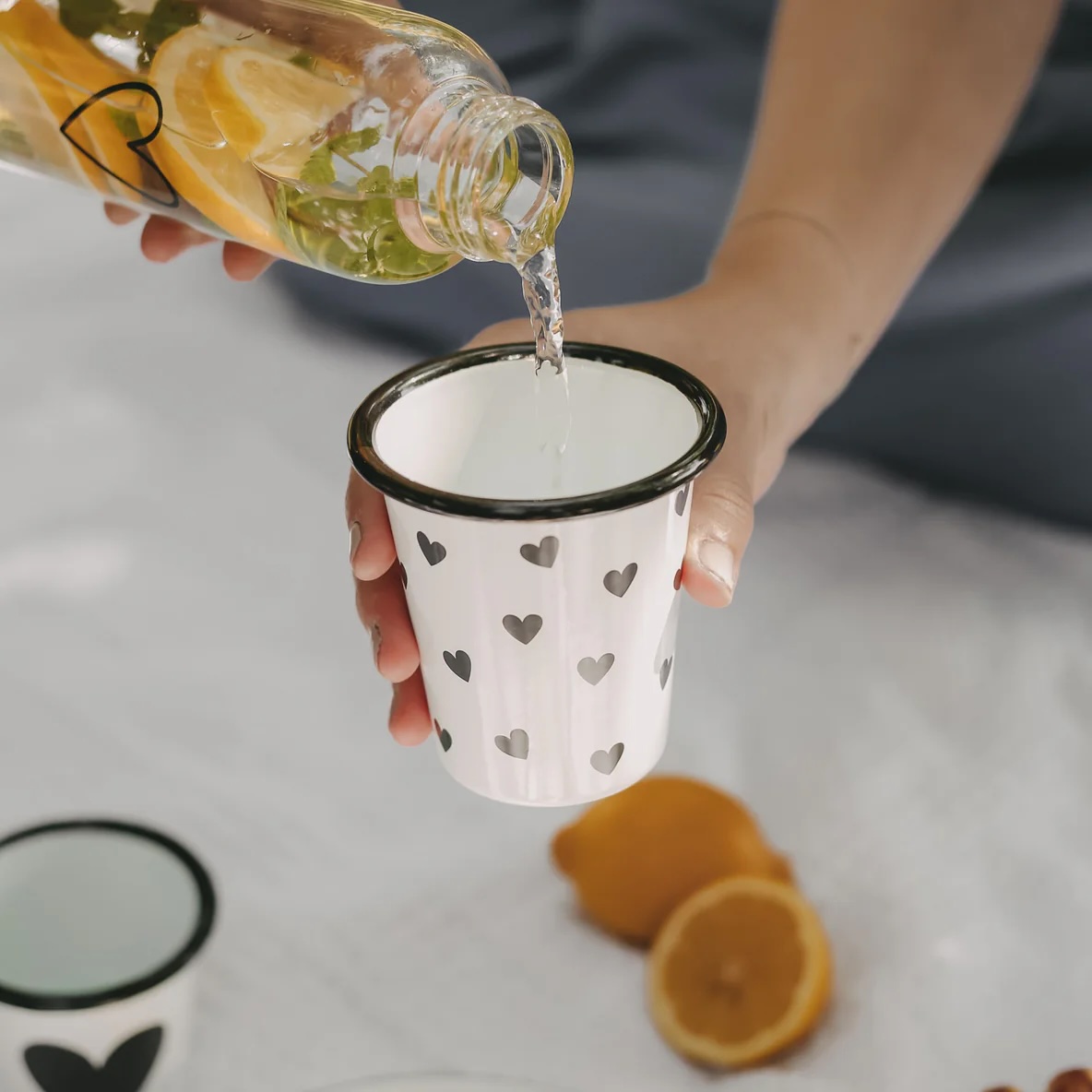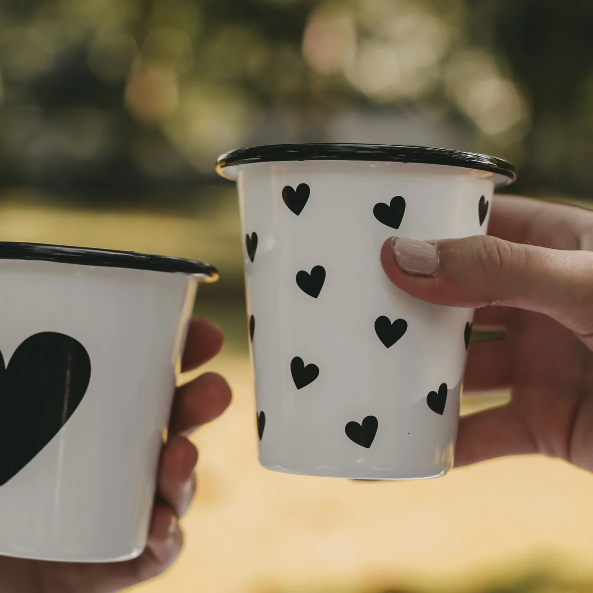 Perfekt für dein nächstes Abenteuer, ob im Camper, beim Picknick im Park oder beim Grillen im Garten. Der Becher ist mit vielen kleinen schwarzen Herzen designt und ein echter Hingucker, zudem auch extrem robust und langlebig. Ideal für jegliche Outdoor-Aktivitäten und selbst auf einem Kindergeburtstag im Freien macht er eine gute Figur.