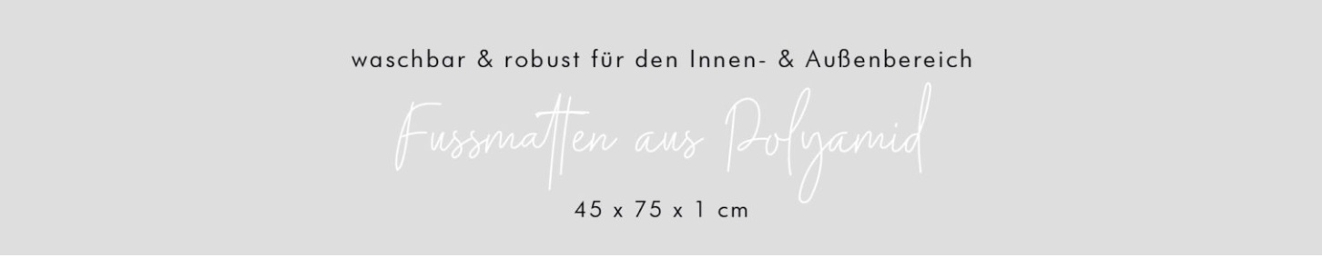 Unsere fein geschwungenen und handgeschriebenen Schriftzüge verleihen unseren Fußmatten einen sehr edlen Touch. Die Oberfläche besteht aus High Twist Polyamid-Fasern, die durch die gedrehte Struktur sich besonders angenehm und weich anfühlt. Die Rückseite besteht aus rutschfestem PVC, was die Fußmatte sicher an ihrem vorgesehenen Ort fixiert. Das Format von ca. 45 x 75 cm ist ideal für den Eingangsbereich! Unsere Türvorleger für den Außenbereich gibt es auch noch in weiteren Designvarianten.
