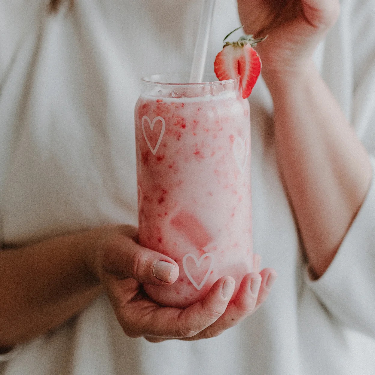 Mit unseren hohen Trinkgläsern kommt richtiges Sommer-Feeling auf. Mit ihren großen Gute-Laune-Prints sind sie perfekt geeignet für selbstgemachte Limonaden, Eistees, deine Lieblings Sommer-Cocktails oder leckere Milchshakes. Für unvergessliche Momente auf dem Balkon am Morgen oder gemütliche sommerliche Abende ist unser Glas mit den Allover Herzen einfach toll. Das Besondere an den Gläsern: Die Dosenform (aus dem engl. Dose=Can) zusammen mit dem weißen Print machen die Gläser zu absoluten Hinguckern. So schön!!