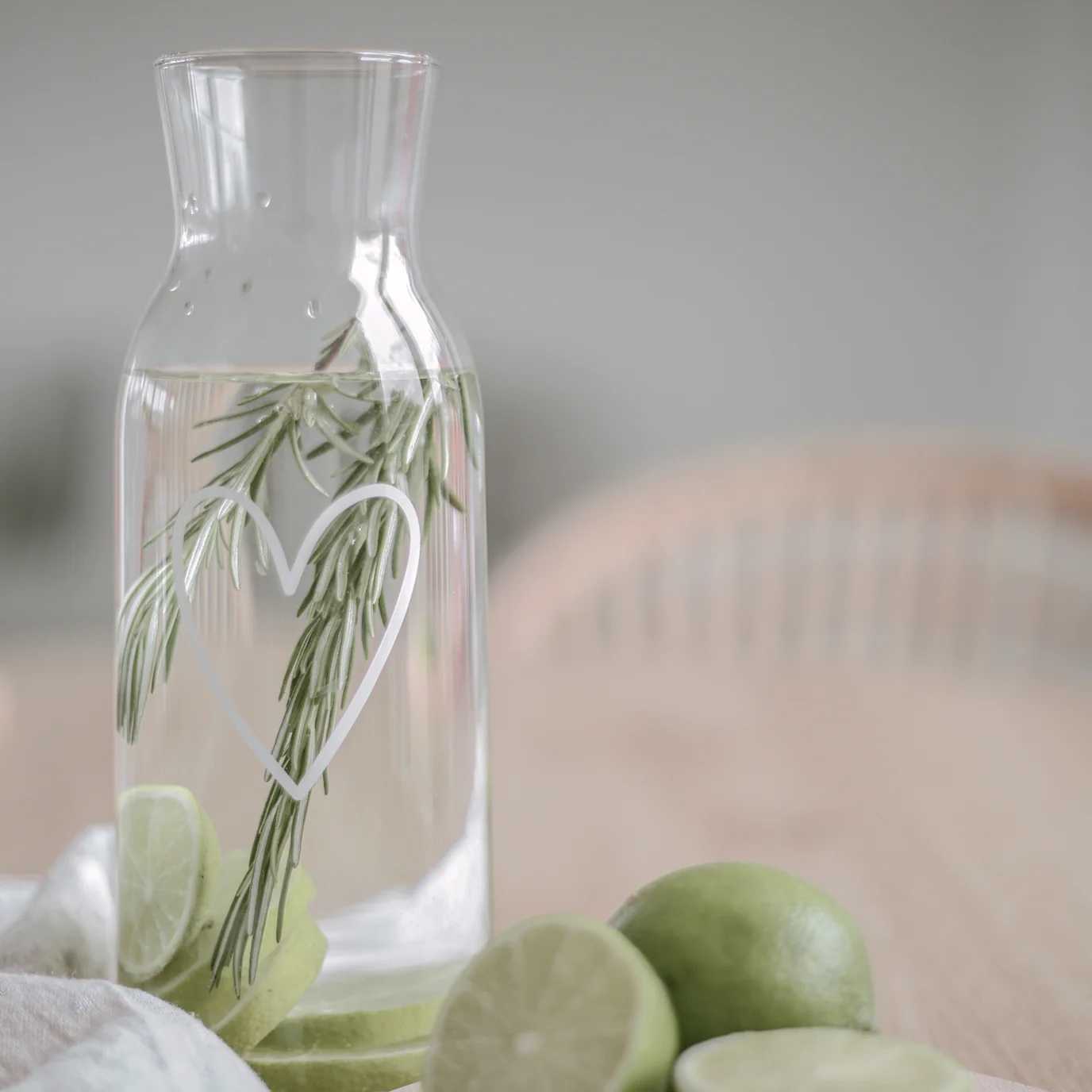 Entdecke unsere wundervolle Karaffe mit weissem Herz an der Glaswand. So schmeckt das Wasser, die selbstgemachte Zintronen-Limonade, der frisch gepresste Saft, der Wein oder vieles mehr doch gleich noch viel besser. Diese Karaffe ziert ein wundervolles Herz und macht den Wasserkrug zu einem ganz besonderer Hingucker auf deinem Frühstücks- oder Abendtisch!