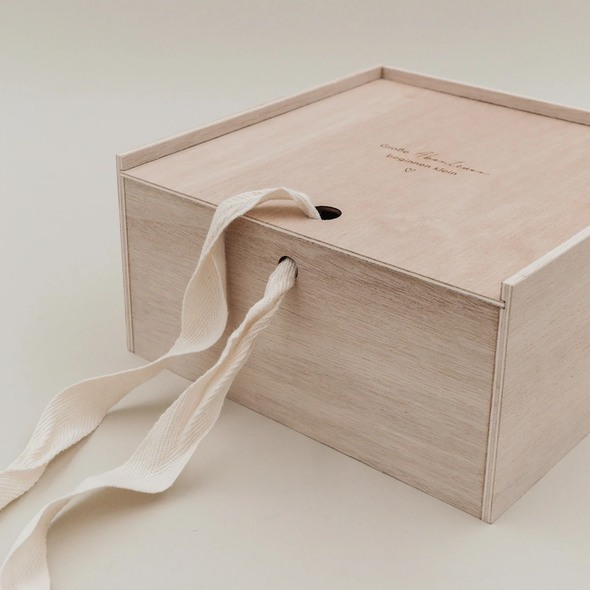 Die quadratische Form bietet großzügig Platz für all die Dinge, die man nie verlieren möchte. Der schlichte Holzdeckel lässt sich einfach herausziehen und ist mit dem liebevollen Schriftzug „Große Abenteuer beginnen klein“ verziert – ein emotionales Statement und wunderschöner Blickfang zugleich, egal ob im Regal, auf dem Sideboard oder im Kinderzimmer.