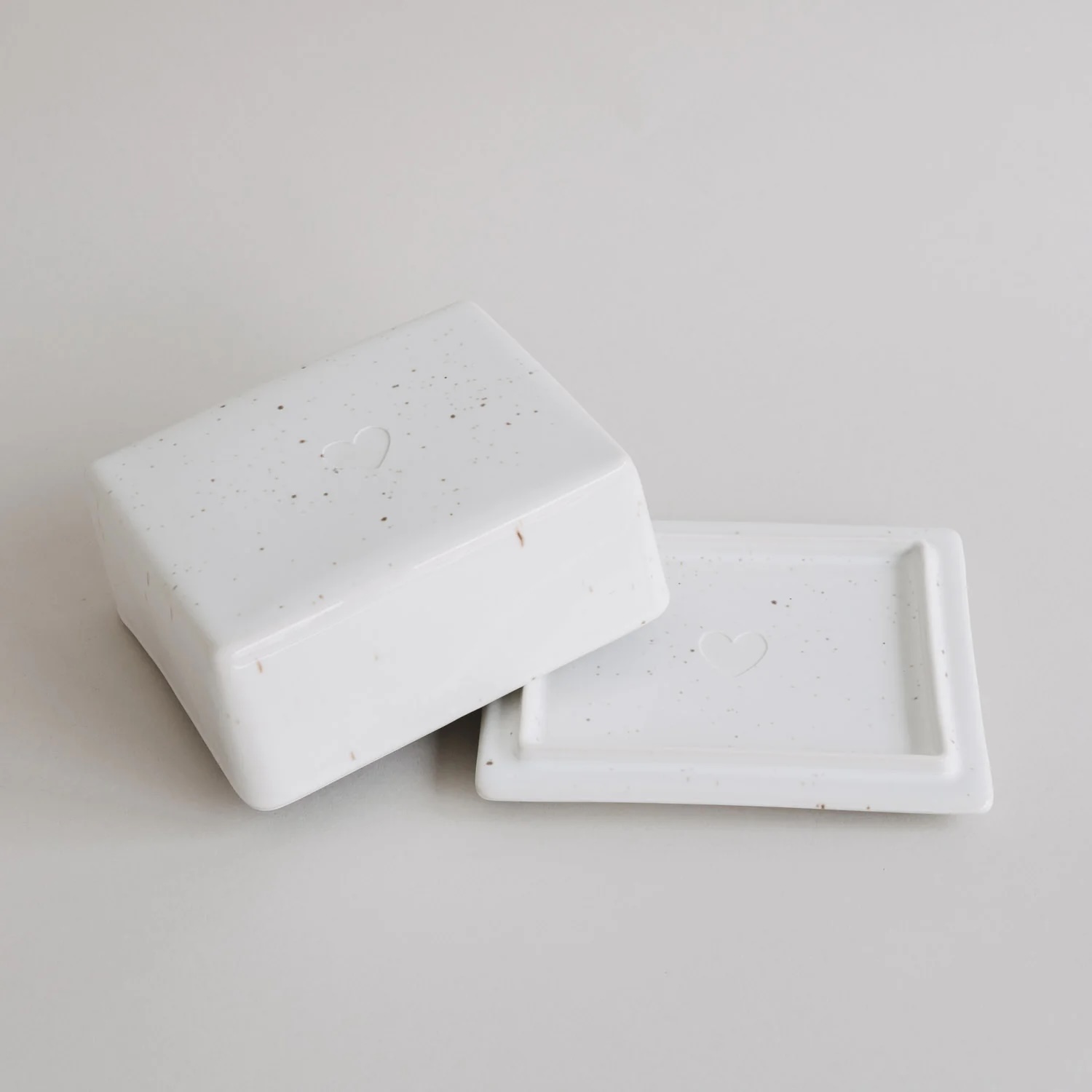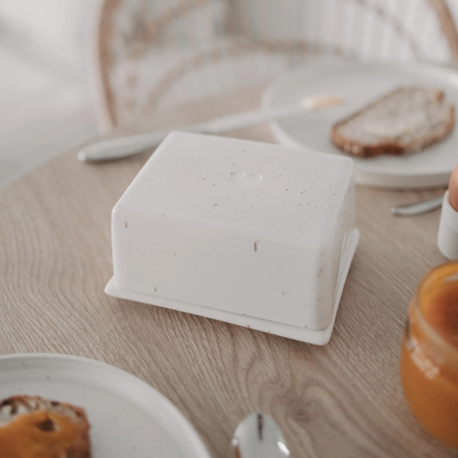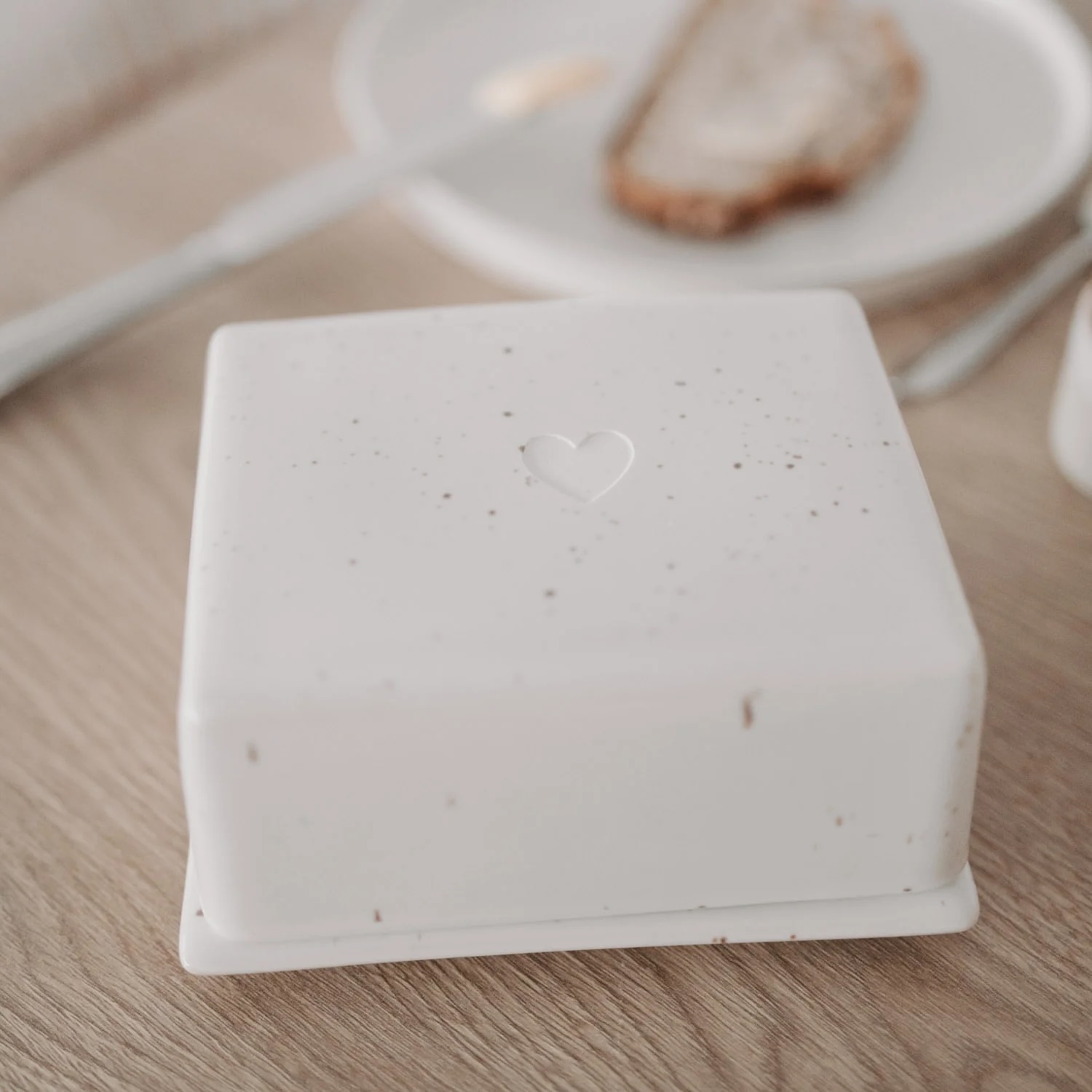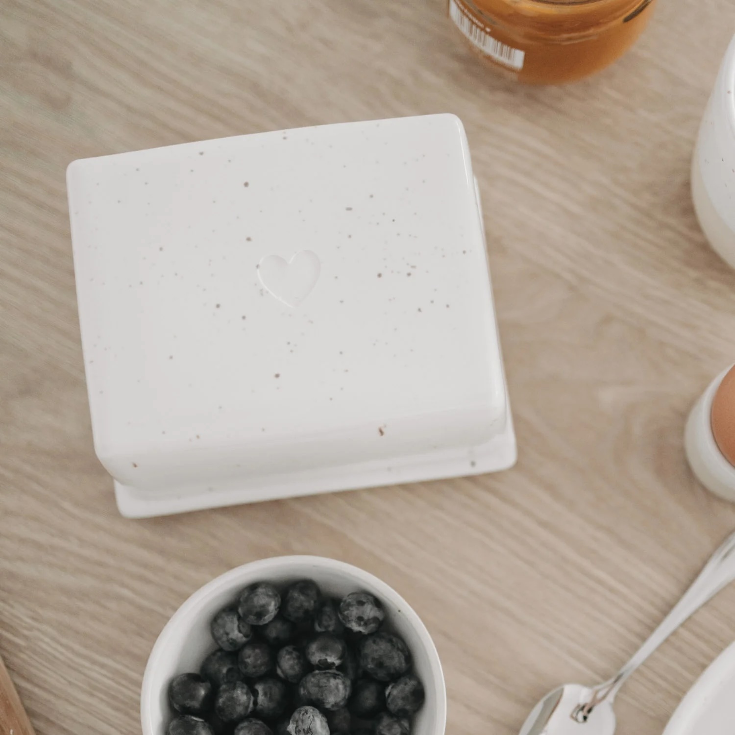 Gefertigt aus hochwertigem Porzellan sorgt sie dafür, dass deine Butter stets frisch und angenehm kühl bleibt – perfekt für den täglichen Genuss. Das sanft gesprenkelte Design verleiht der Butterdose eine natürliche, ruhige Ausstrahlung, während das feine, eingeprägte Herz auf dem Deckel für eine liebevolle Note sorgt.