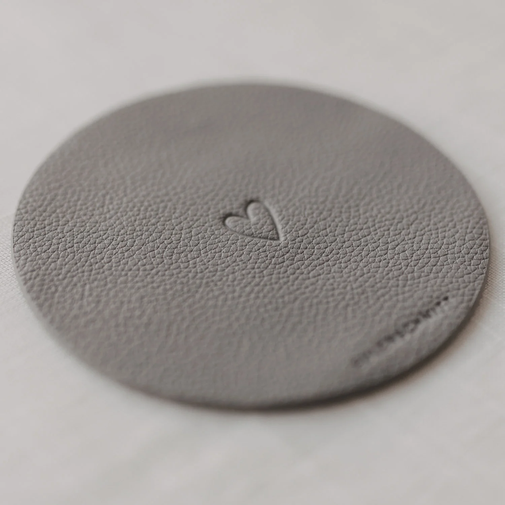 Die Untersetzer sind beidseitig einsetzbar und überzeugen durch ihre harmonische Farbkombination: Eine Seite zeigt sich in einem sanften Hellgrau mit filigranem Eulenschnitt-Schriftzug am unteren Rand und ein zart eingeprägtes Herz in der Mitte, die andere Seite in elegantem Anthrazit ziert der eingeprägte Schriftzug „Rundum glücklich“.