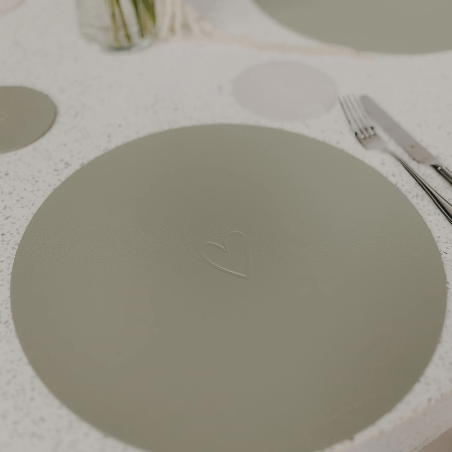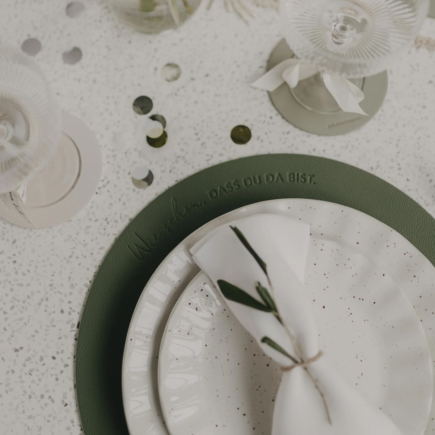 Eine Seite zeigt den zarten, eingeprägten Schriftzug „Wie schön, dass du da bist“ – ein kleiner Moment der Wertschätzung, der jeden Platz ganz besonders macht. Die Rückseite trägt ein fein geprägtes Herzmotiv, ergänzt durch unser dezentes Eulenschnitt-Logo am unteren Rand. Beide Seiten harmonieren wunderbar mit den natürlichen Grüntönen und lassen sich mühelos in jede Tischdekoration integrieren – von schlicht bis verspielt.