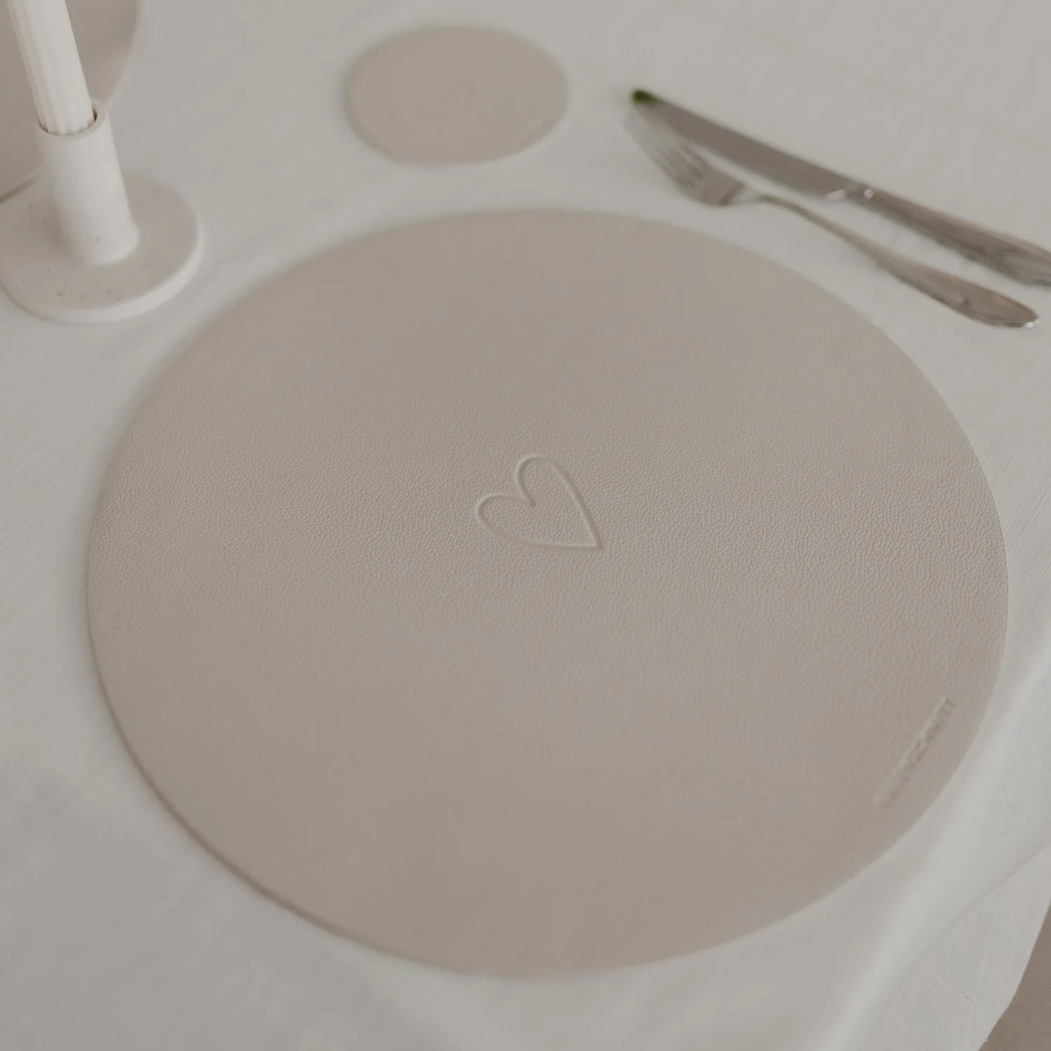 Eine Seite trägt den fein eingeprägten Schriftzug „Lieblingsmensch“, der deinem Tisch eine persönliche, herzliche Botschaft verleiht. Die Rückseite zeigt ein zart geprägtes Herzmotiv in der Mitte, ergänzt durch das dezente Eulenschnitt-Logo am Rand – ein kleines, hochwertiges Detail, das das Platzset besonders macht. Die cremigen Farbtöne lassen sich mühelos mit verschiedenen Geschirrstilen kombinieren und wirken zu jeder Jahreszeit harmonisch.