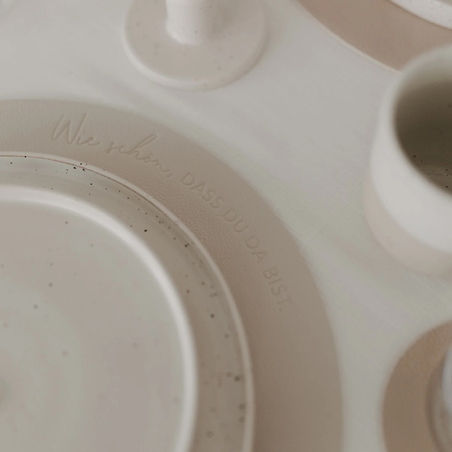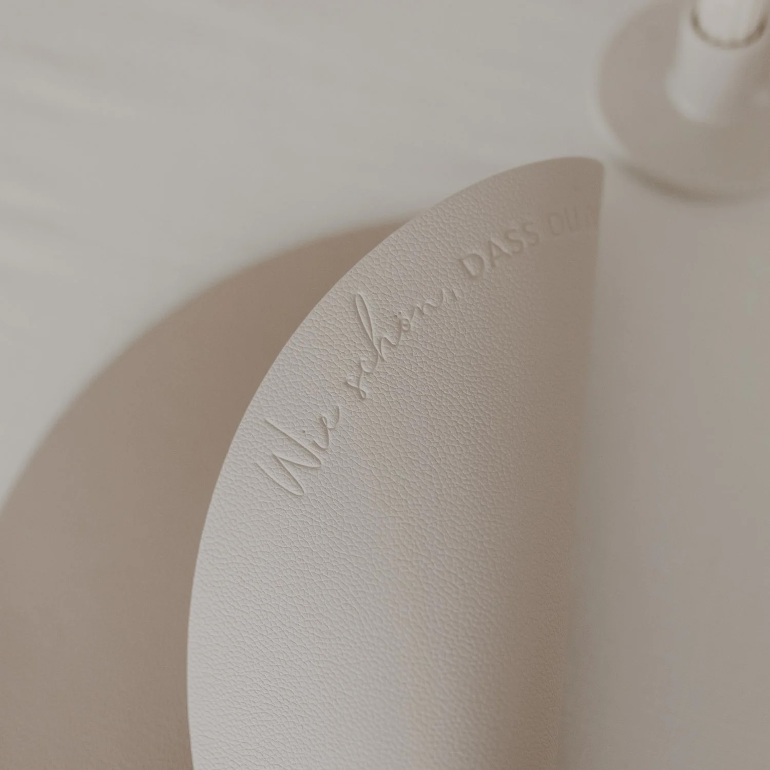 Eine Seite trägt den herzlich formulierten Spruch „Wie schön, dass du da bist“, der jedem Anlass eine persönliche Wertschätzung verleiht. Die Rückseite zeigt ein fein geprägtes Herzmotiv, ergänzt durch unser dezentes Eulenschnitt-Logo im unteren Bereich. Beide Designs harmonieren perfekt mit den cremigen, weichen Farbtönen und fügen sich mühelos in jede Tischdekoration ein.
