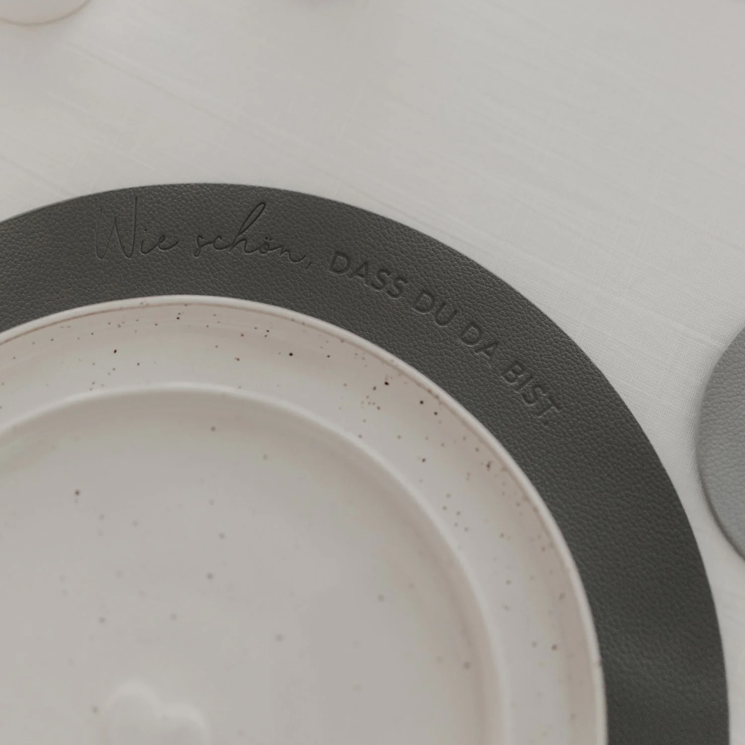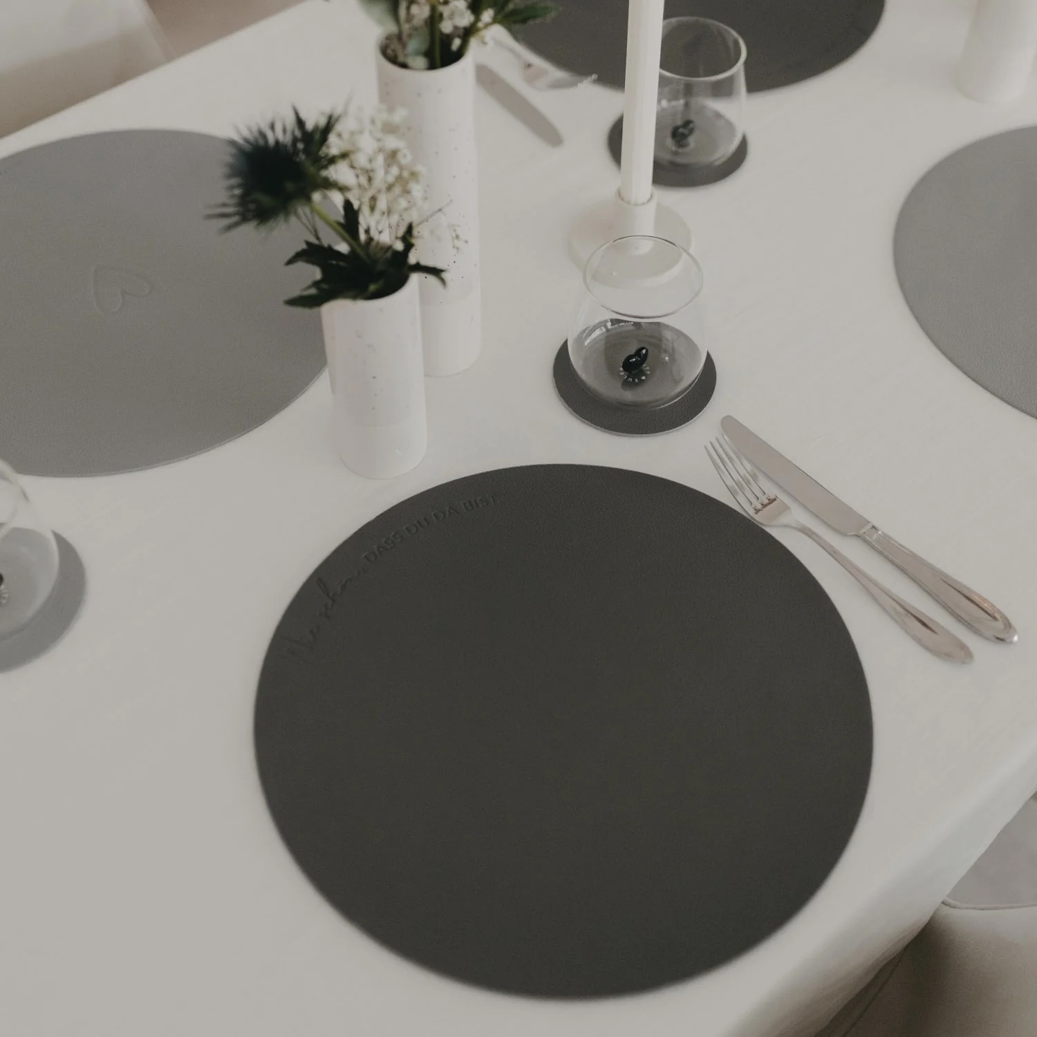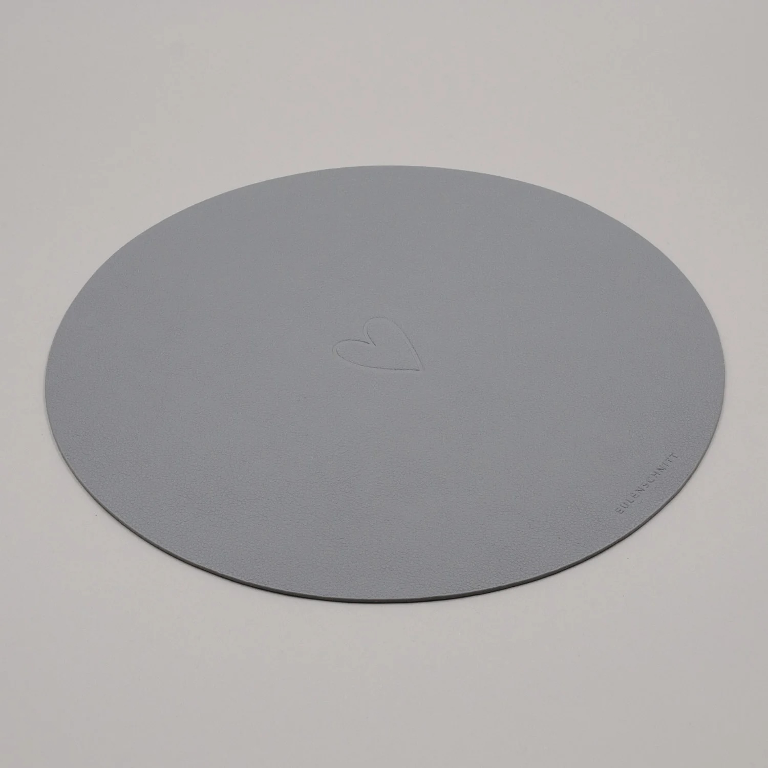 Die Besonderheit: Das Platzset ist beidseitig nutzbar. Eine Seite zeigt sich in einem edlem Anthrazit mit feinem Schriftzug „Wie schön, dass du da bist“. Die Rückseite erscheint in einem weichen, hellen Grauton – mit geprägtem Herzsymbol. Auf der hellen Seite ist zusätzlich der kleine Eulenschnitt-Schriftzug am unteren Rand zu finden. Beide Seiten überzeugen durch ihre ruhige Ästhetik und lassen sich harmonisch mit verschiedenen Tischdekorationen kombinieren.