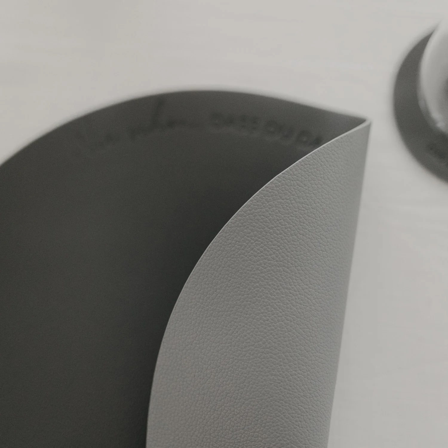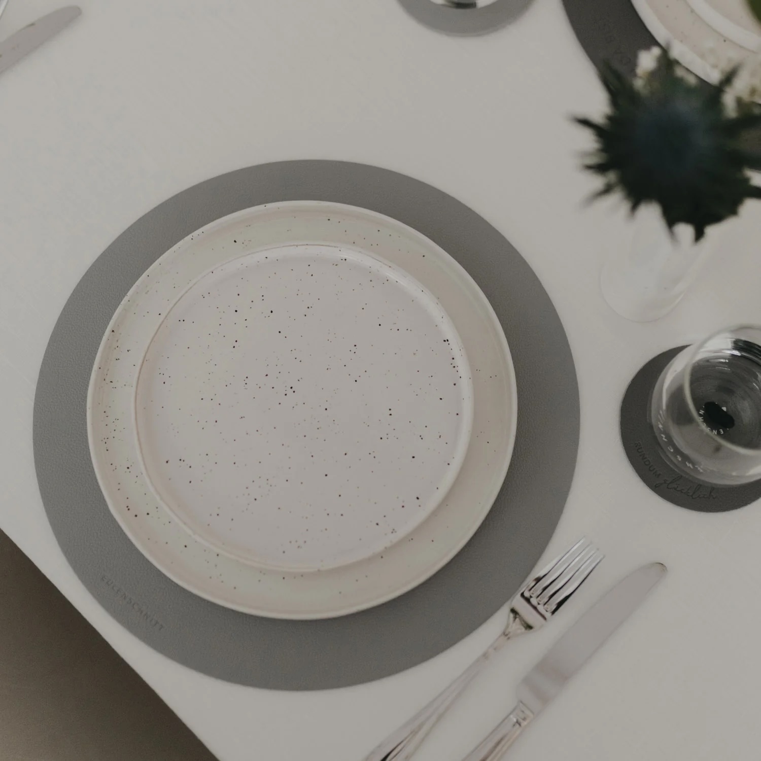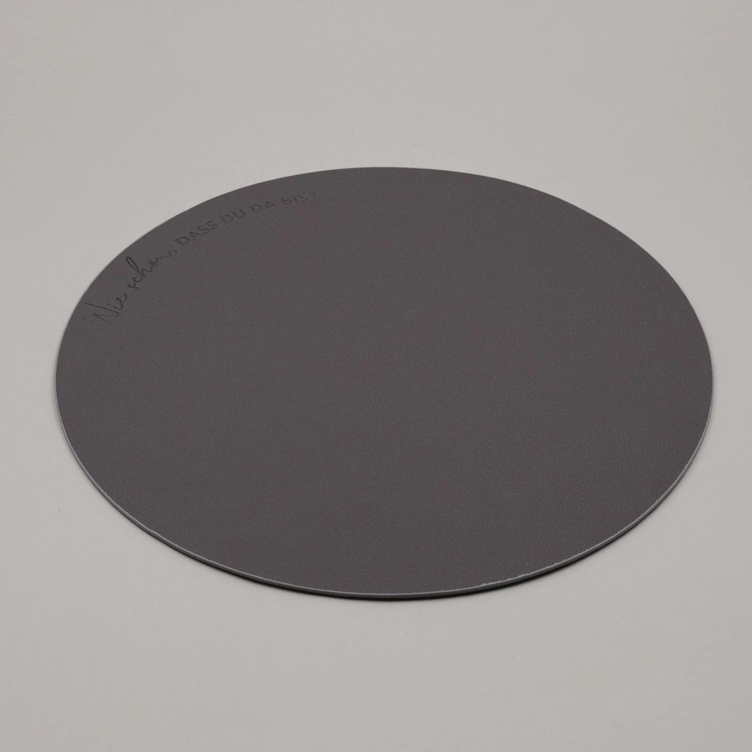Die Besonderheit: Das Platzset ist beidseitig nutzbar. Eine Seite zeigt sich in einem edlem Anthrazit mit feinem Schriftzug „Wie schön, dass du da bist“. Die Rückseite erscheint in einem weichen, hellen Grauton – mit geprägtem Herzsymbol. Auf der hellen Seite ist zusätzlich der kleine Eulenschnitt-Schriftzug am unteren Rand zu finden. Beide Seiten überzeugen durch ihre ruhige Ästhetik und lassen sich harmonisch mit verschiedenen Tischdekorationen kombinieren.