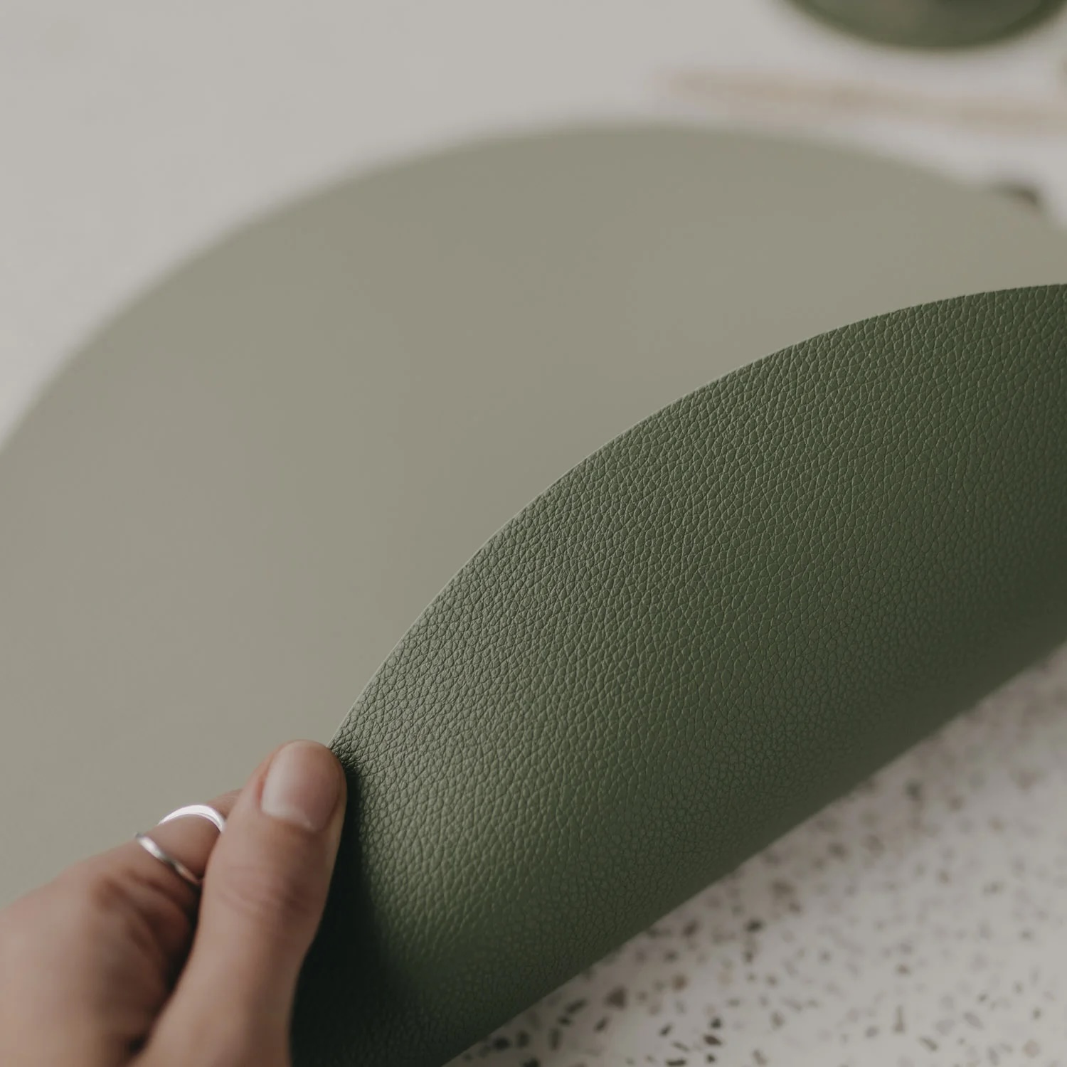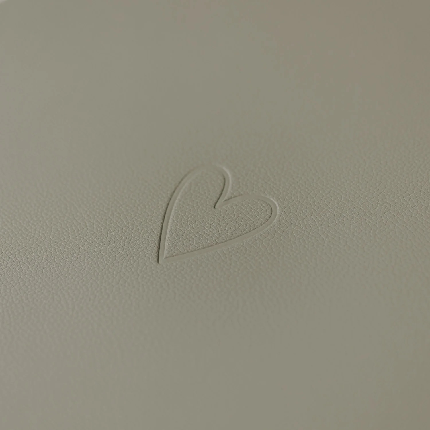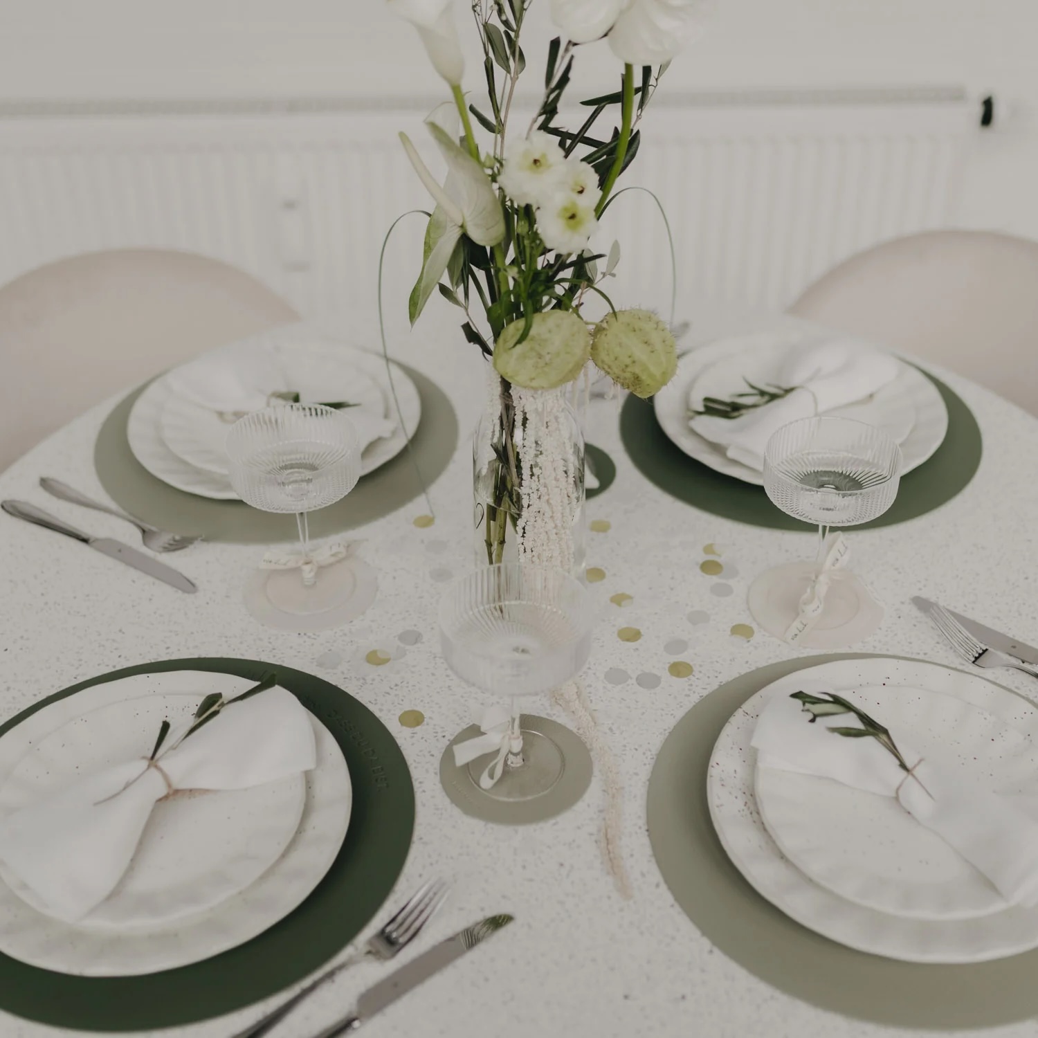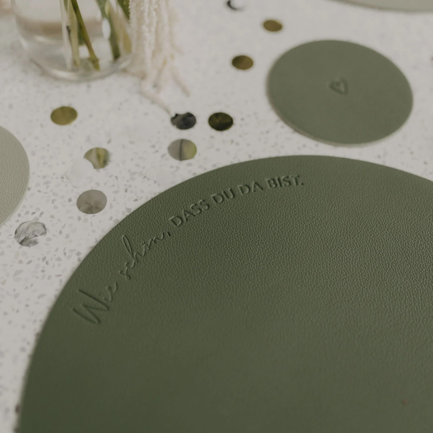 Eine Seite zeigt den zarten, eingeprägten Schriftzug „Wie schön, dass du da bist“ – ein kleiner Moment der Wertschätzung, der jeden Platz ganz besonders macht. Die Rückseite trägt ein fein geprägtes Herzmotiv, ergänzt durch unser dezentes Eulenschnitt-Logo am unteren Rand. Beide Seiten harmonieren wunderbar mit den natürlichen Grüntönen und lassen sich mühelos in jede Tischdekoration integrieren – von schlicht bis verspielt.