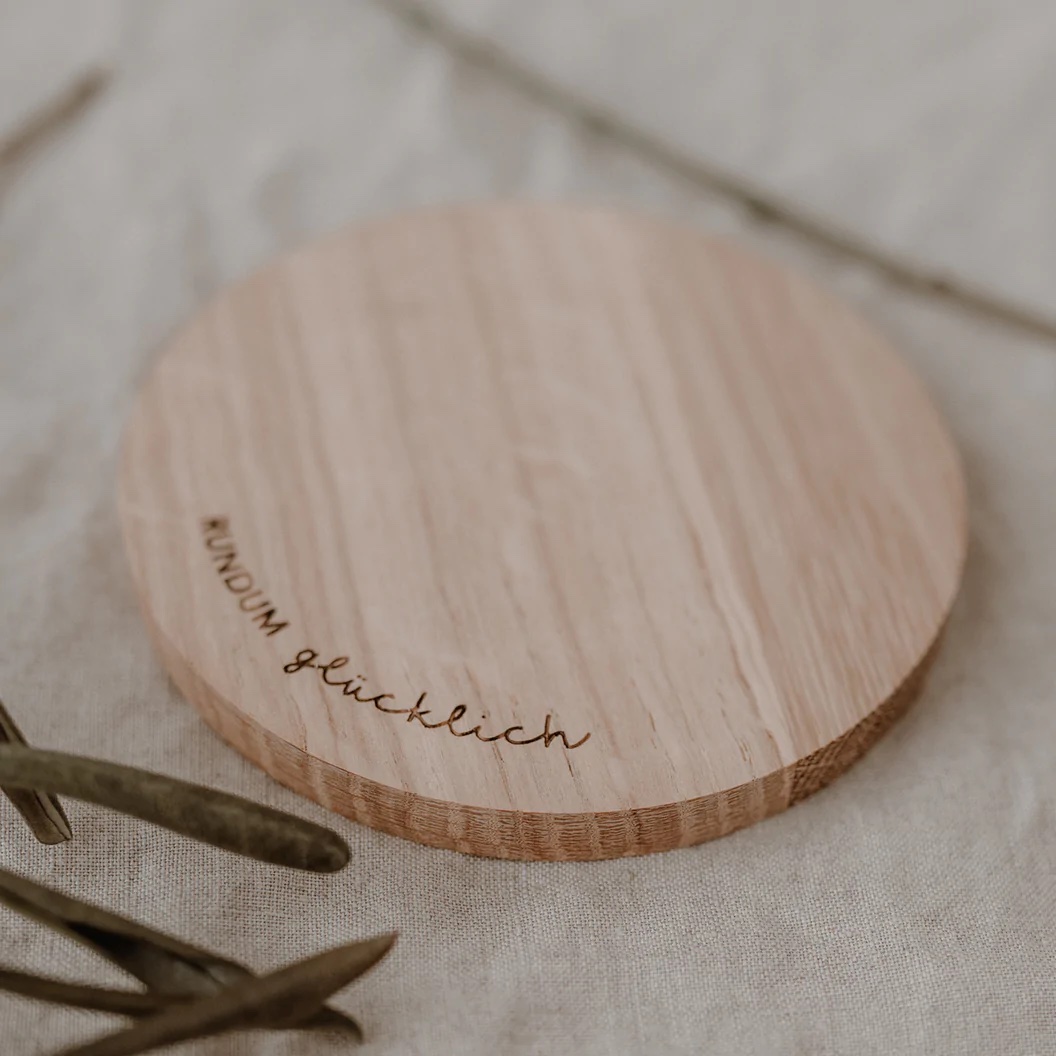 Die perfekten Begleiter zum Servieren von Getränken. Das Tolle an unseren neuen Untersetzern sind die unterschiedlichen Lasergravuren. Der Untersetzer rundum glücklich ziert der handgemalte rundum glücklich auf der Vorderseite und unser Eulenschnitt Logo auf der Unterseite. So könnt ihr ganz nach Belieben eure Lieblingsdesigns zusammenstellen und bei dem nächsten Brunch, Kaffee Date oder Dinnerabend mit liebevoll designten Untersetzern punkten. Jeder Gast kann so sein eigenes passendes Design haben, sodass jeder weiß welches sein Glas ist. Sie haben einen Durchmesser von 11,2 cm und eine Stärke von 1 cm.