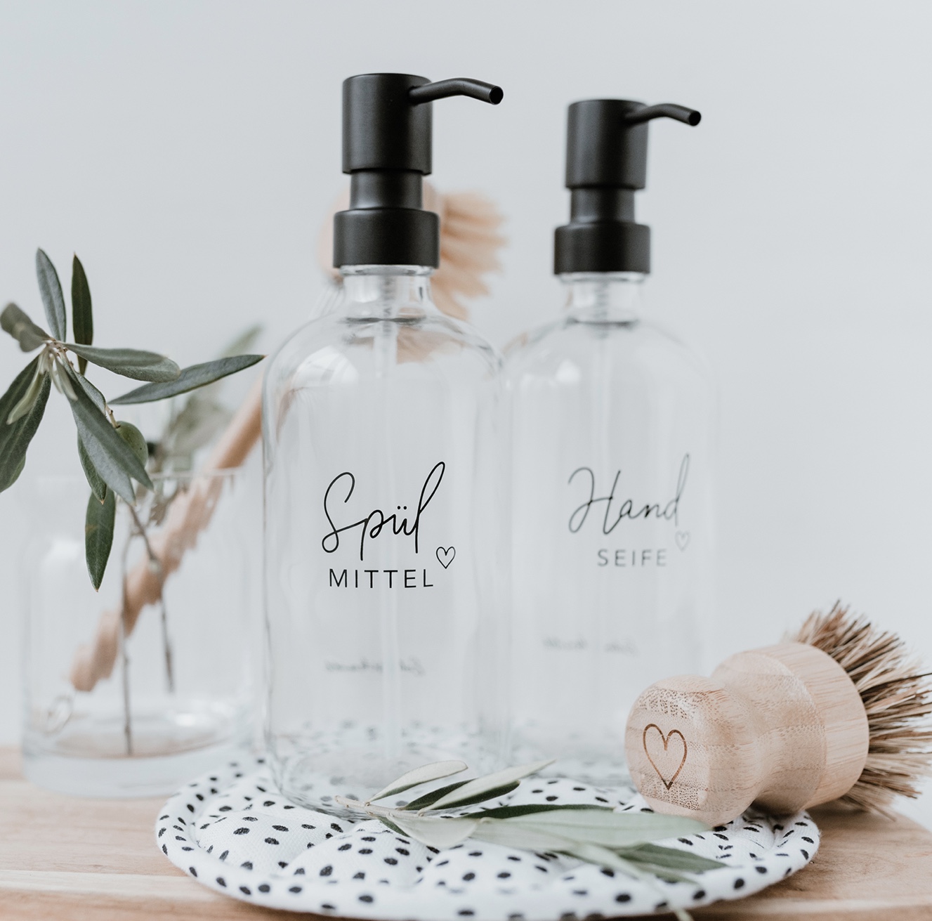 Das schöne Glas mit schwarzer Schrift macht den Seifenspender zu einem absoluten Hingucker in Eurer Küche oder in Eurem Bad! Der handgeschrieben Schriftzug “Handseife” sowie ein kleines Herz zieren die Vorderseite, der Eulenschnitt Schriftzug die Rückseite des Spenders. Die wiederbefüllbare Glasflasche fasst ein Füllvolumen von 500ml und enthält sowohl einen schwarzen Pumpverschluss sowie einen schwarzen Schraubdeckel für den Transport. Damit ist unser Seifenspender Handseife aus transparentem Glas nicht nur optisch ein echtes Highlight, sondern auch noch besonders nachhaltig. Durch den zusätzlichen Schraubdeckel könnt Ihr die Glasspender ganz einfach mit in den nächsten Unverpackt-Laden nehmen und Euch die Handseife direkt umfüllen lassen. Die Seifenspender kommen unbefüllt, sodass Ihr Sie mit Eurer Lieblingshandseife befüllen könnt.