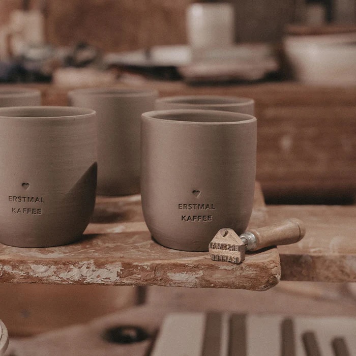 Wir haben sehr viel Herzblut in eine neue Kollektion gesteckt, die von der Form, dem Ton, dem Glazing, sowie dem Design von uns entwickelt wurde. Eine kleine Töpferei aus Portugal produziert diese wundervollen Becher in liebevoller Handarbeit & ist ein großartiger neuer Begleiter auf unserem kreativen Weg. Unsere Becher lassen die Herzen höher schlagen, die die Individualität von Ton & Glasur lieben, denn jeder einzelne Becher hat seinen ganz eigenen Touch. Da alle Becher mit der Hand gefertigt, gebrannt, geprägt, abgeschliffen, geglazt & nochmal gebrannt werden, gibt es Unterschiede in der Drucktiefe, in der Höhe sowie der Geradlinigkeit. Das minimalistische Design und die natürlichen Farbnuancen werden von einer wunderschönen Blindprägung “Erstmal Kaffee” abgerundet. Wir sind verliebt & voller purer Freude & können es kaum abwarten unsere neue Kollektion in Euren Händen zu sehen!