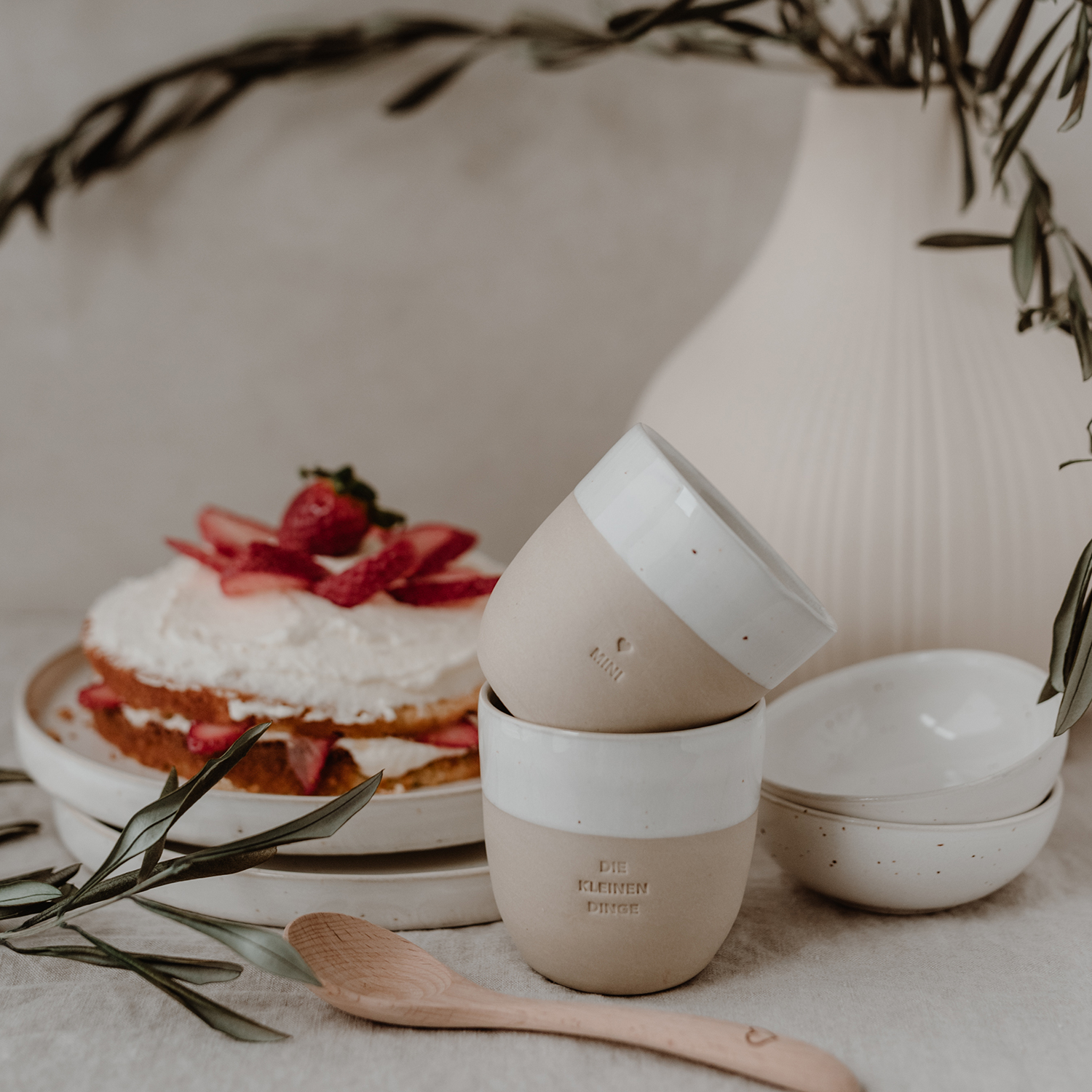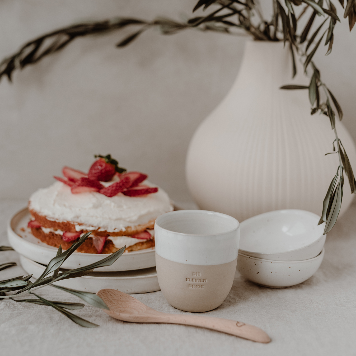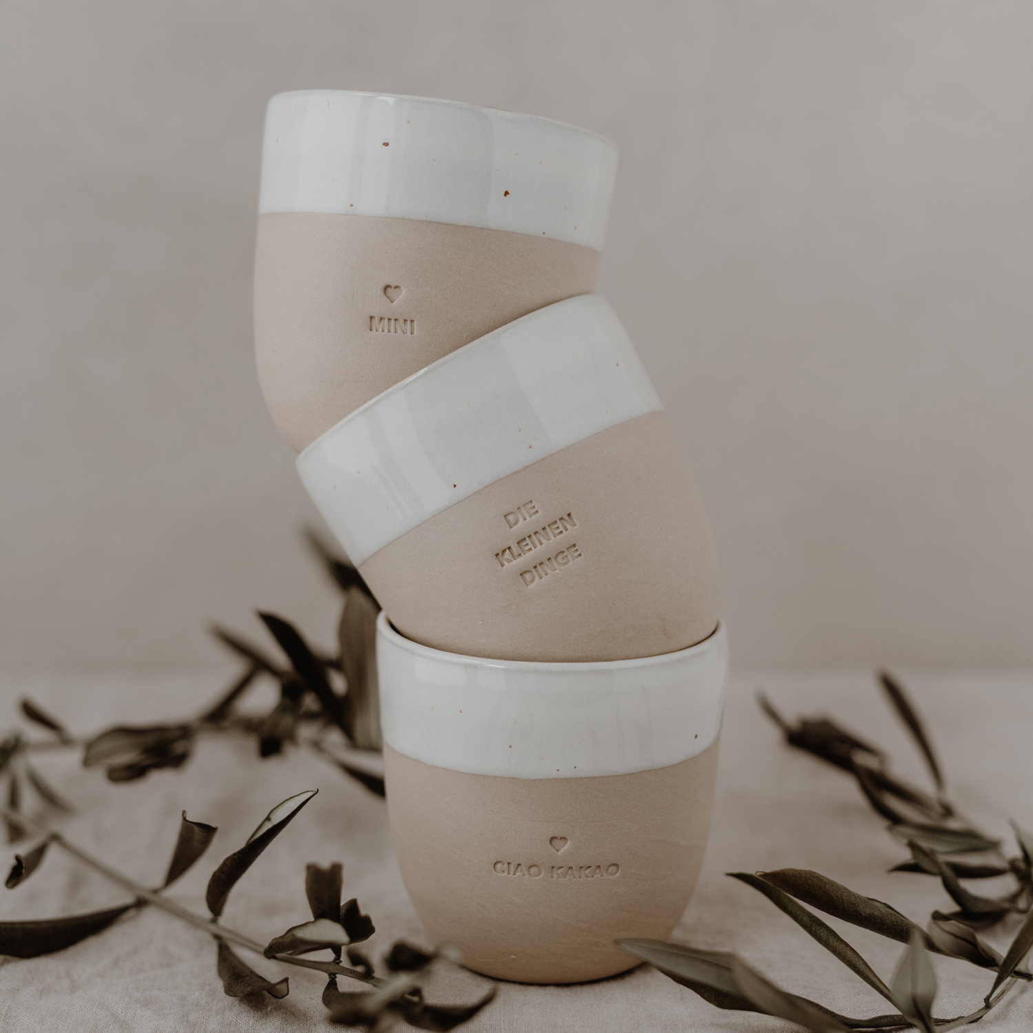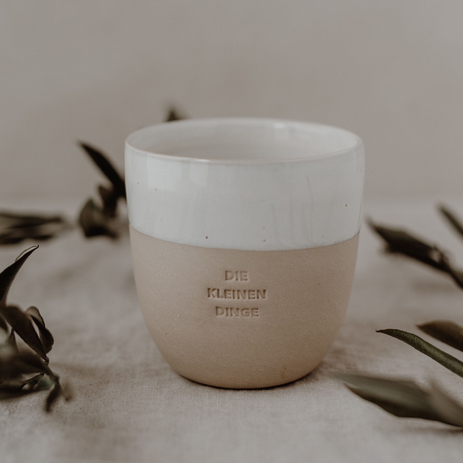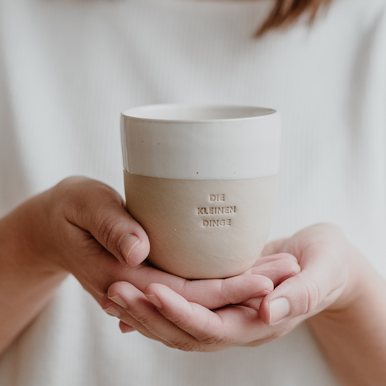Wir haben sehr viel Herzblut in eine neue Kollektion gesteckt, die von der Form, dem Ton, dem Glazing, sowie dem Design von uns entwickelt wurde. Eine kleine Töpferei aus Portugal produziert diese wundervollen Becher in liebevoller Handarbeit & ist ein großartiger neuer Begleiter auf unserem kreativen Weg. Unsere Becher lassen die Herzen höher schlagen, die die Individualität von Ton & Glasur lieben, denn jeder einzelne Becher hat seinen ganz eigenen Touch. Da alle Becher mit der Hand gefertigt, gebrannt, geprägt, abgeschliffen, geglazt & nochmal gebrannt werden, gibt es Unterschiede in der Drucktiefe, in der Höhe sowie der Geradlinigkeit. Das minimalistische Design und die natürlichen Farbnuancen werden von einer wunderschönen Blindprägung “Kleine Dinge” abgerundet. Wir sind verliebt & voller purer Freude & können es kaum abwarten unsere neue Kollektion in Euren Händen zu sehen!
