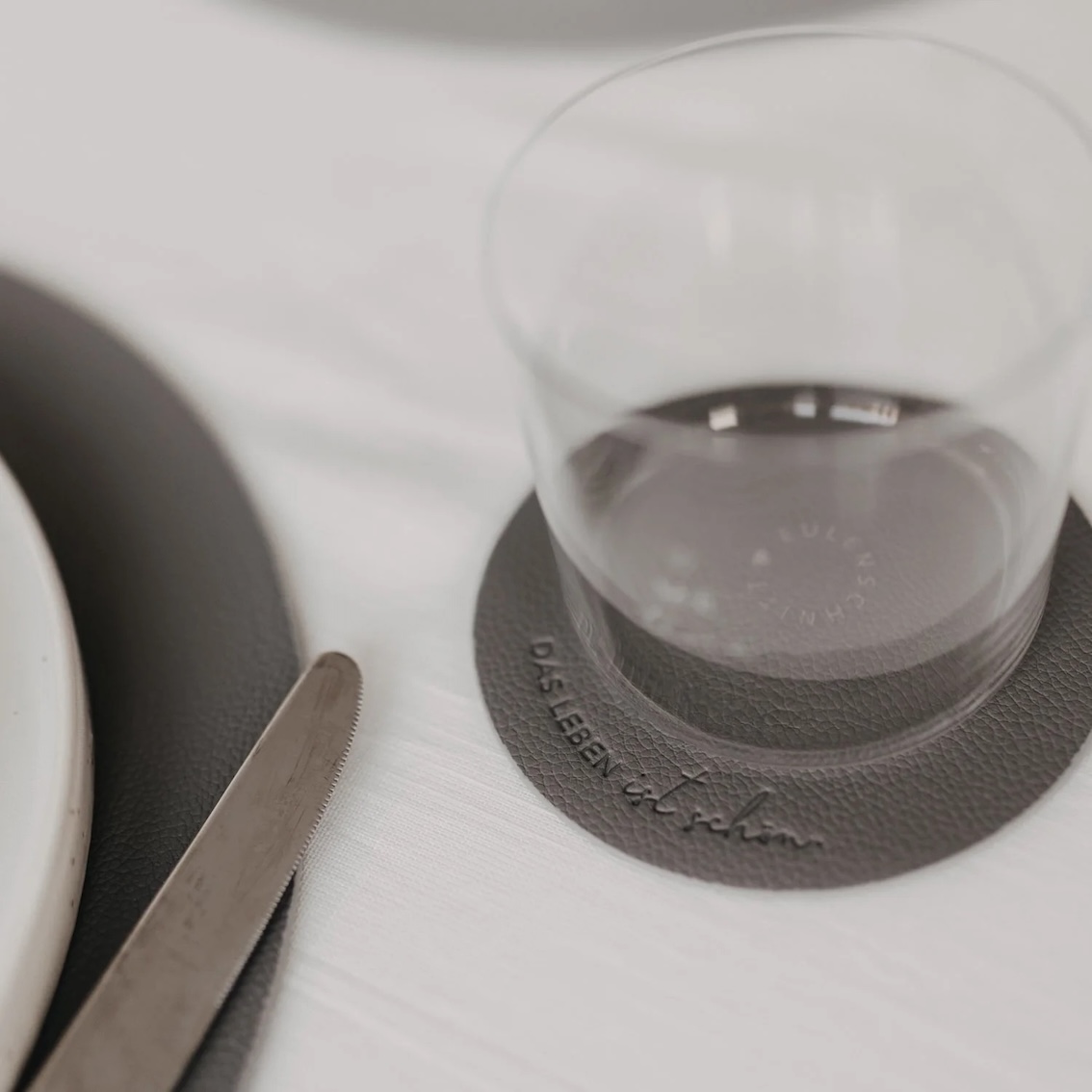 Die Untersetzer sind beidseitig einsetzbar und überzeugen durch ihre harmonische Farbkombination: Eine Seite zeigt sich in einem sanften Hellgrau mit filigranem Eulenschnitt-Schriftzug am unteren Rand und ein zart eingeprägtes Herz in der Mitte, die andere Seite in elegantem Anthrazit ziert der eingeprägte Schriftzug „Das Leben ist schön“.