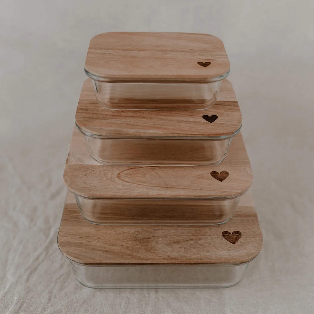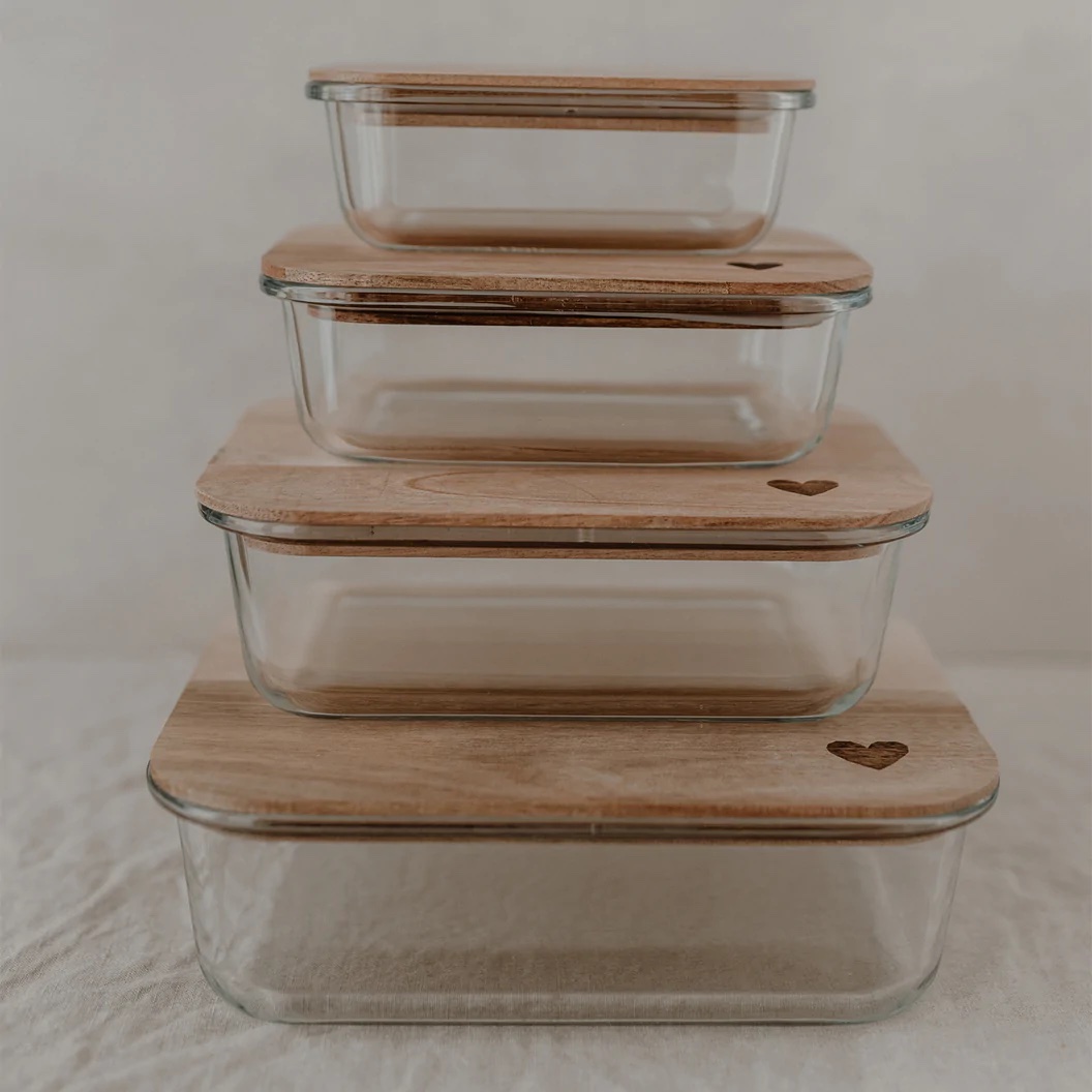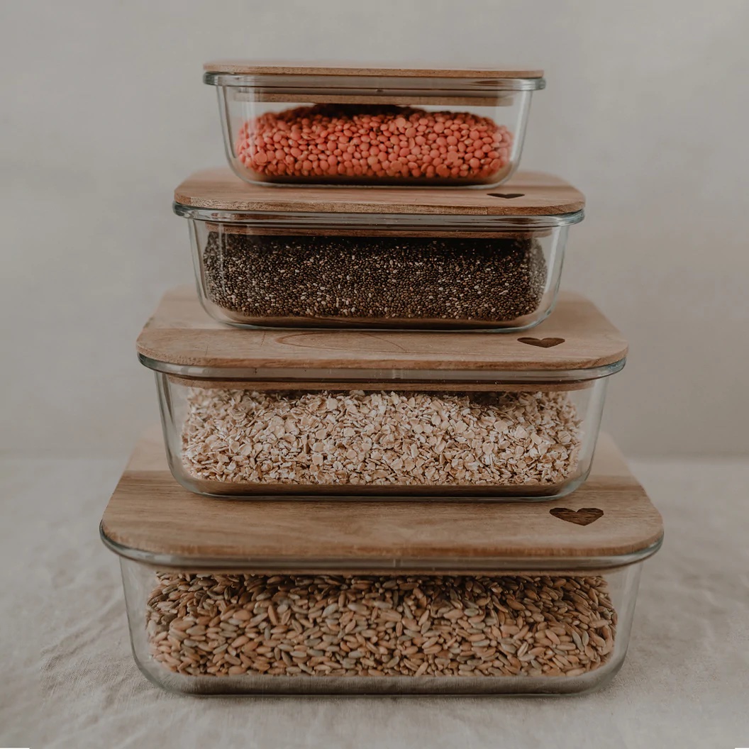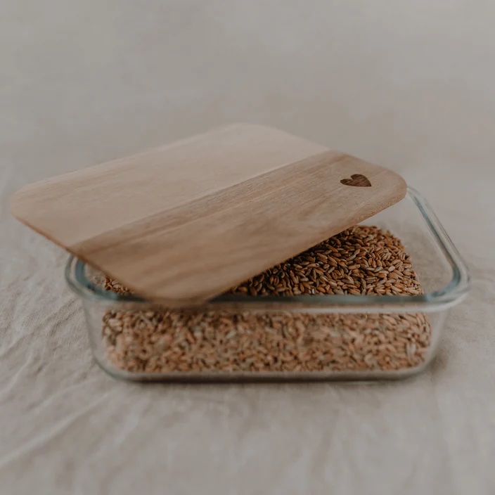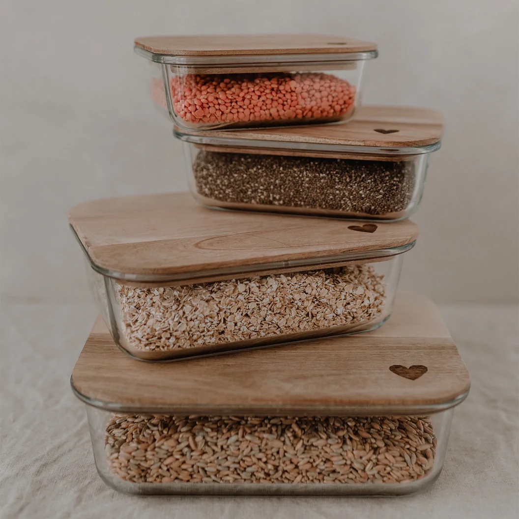 Wir können nicht glauben, wie schön man seine Vorräte aufbewahren kann mit unseren Vorratsbehältern aus Glas. Alle Gläser bestehen aus hochwertigem und strapazierfähigem Borosilikatglas. Sie werden mit einem Akazienholz Deckel geliefert, der ein wundervolles Herz graviert hat. Borosilikatglas ist ein sehr robustes Material, das spülmaschinenfest und zu 100% recyclebar ist. Unsere Deckel werden aus unbehandeltem Akazienholz gefertigt, sodass jeder Deckel ein Unikat ist und einzigartig in seiner Struktur. Ein Silikonring zum luftdichtem Verschließen ist natürlich auch mit dabei.