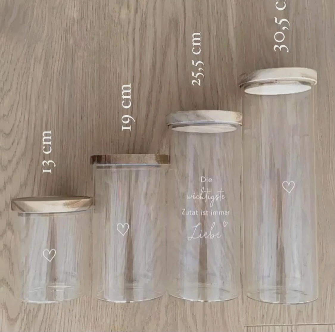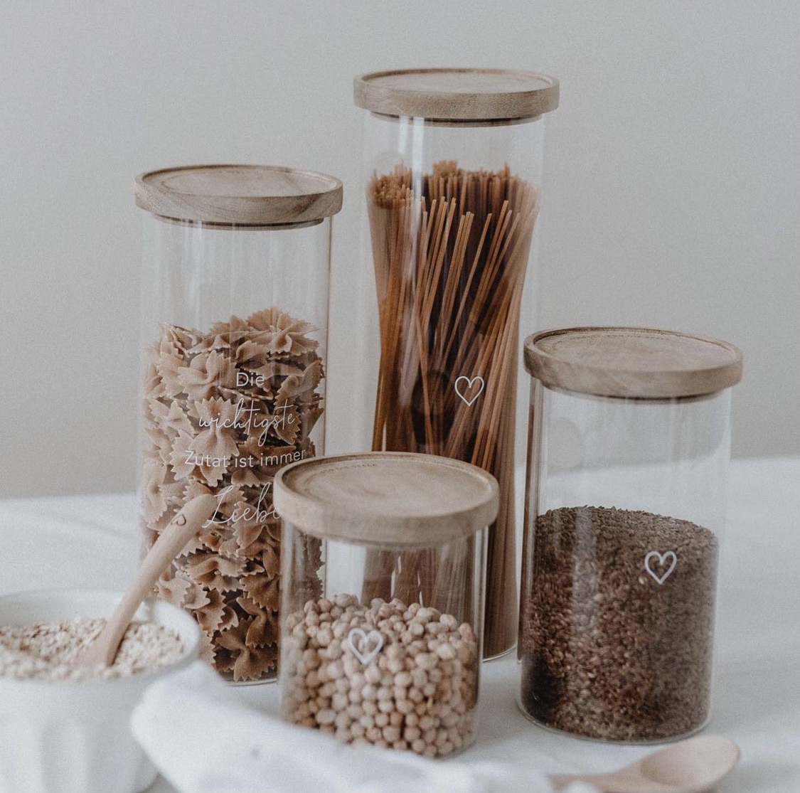 Wir können nicht glauben, wie schön man seine Vorräte aufbewahren kann mit unseren Vorratsgläser aus Glas. Das Glas besteht aus hochwertigem und strapazierfähigem Borosilikatglas und ist mit einem weißem Druck veredelt. Der Deckel ist aus Akazienholz, mit dem Logo und Motto “Konfetti für die Seele“. Borosilikatglas ist ein sehr robustes Material, das spülmaschinenfest und zu 100% recyclebar ist. Die Deckel werden aus unbehandeltem Akazienholz gefertigt, sodass jeder Deckel ein Unikat ist und einzigartig in seiner Struktur. Ein Silikonring zum luftdichten Verschließen ist natürlich auch mit dabei.