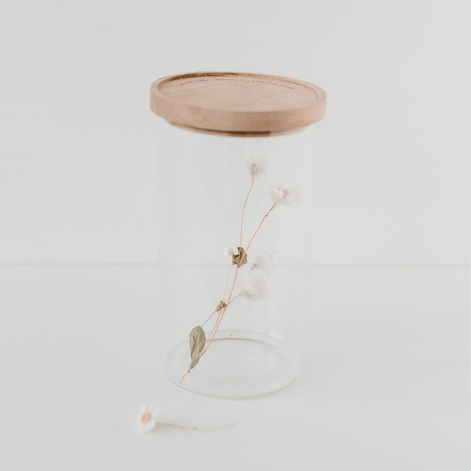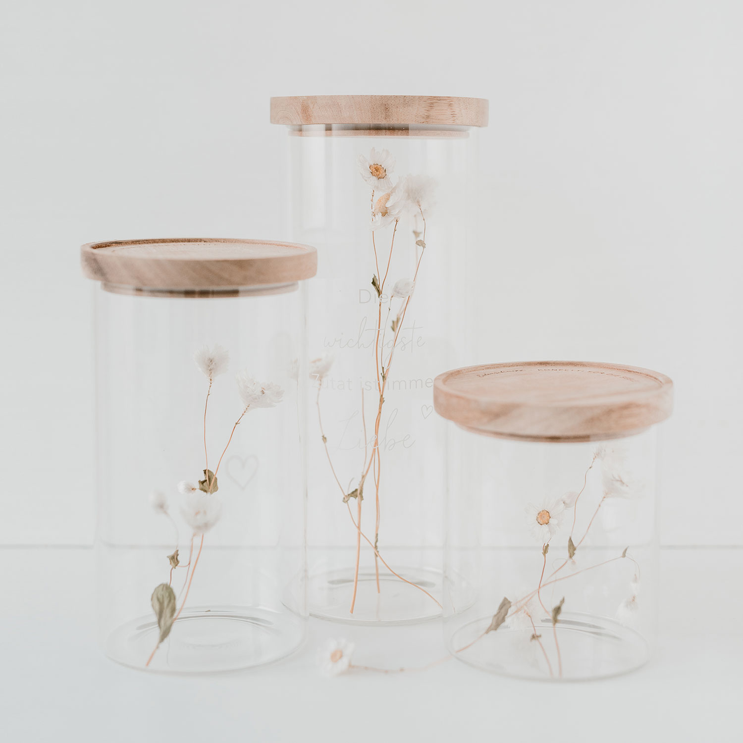 Wir können nicht glauben, wie schön man seine Vorräte aufbewahren kann mit unseren Vorratsgläser aus Glas. Das Glas besteht aus hochwertigem und strapazierfähigem Borosilikatglas und ist mit einem weißem Druck veredelt. Der Deckel ist aus Akazienholz, mit dem Logo und Motto “Konfetti für die Seele“. Borosilikatglas ist ein sehr robustes Material, das spülmaschinenfest und zu 100% recyclebar ist. Die Deckel werden aus unbehandeltem Akazienholz gefertigt, sodass jeder Deckel ein Unikat ist und einzigartig in seiner Struktur. Ein Silikonring zum luftdichten Verschließen ist natürlich auch mit dabei.